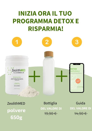 Il set detox offre una combinazione ben studiata del prodotto medico clinicamente testato ZeolithMED, accessori di alta qualità e una solida conoscenza dell'applicazione, ideale per il vostro programma di disintossicazione di 12 settimane.