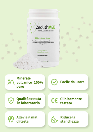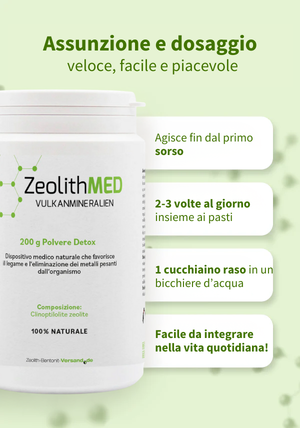 ZeolithMED- prodotto medico naturale da ingerire per alleviare l'organismo legando ed eliminando i metalli pesanti (piombo, mercurio, cromo, cadmio, alluminio e nichel